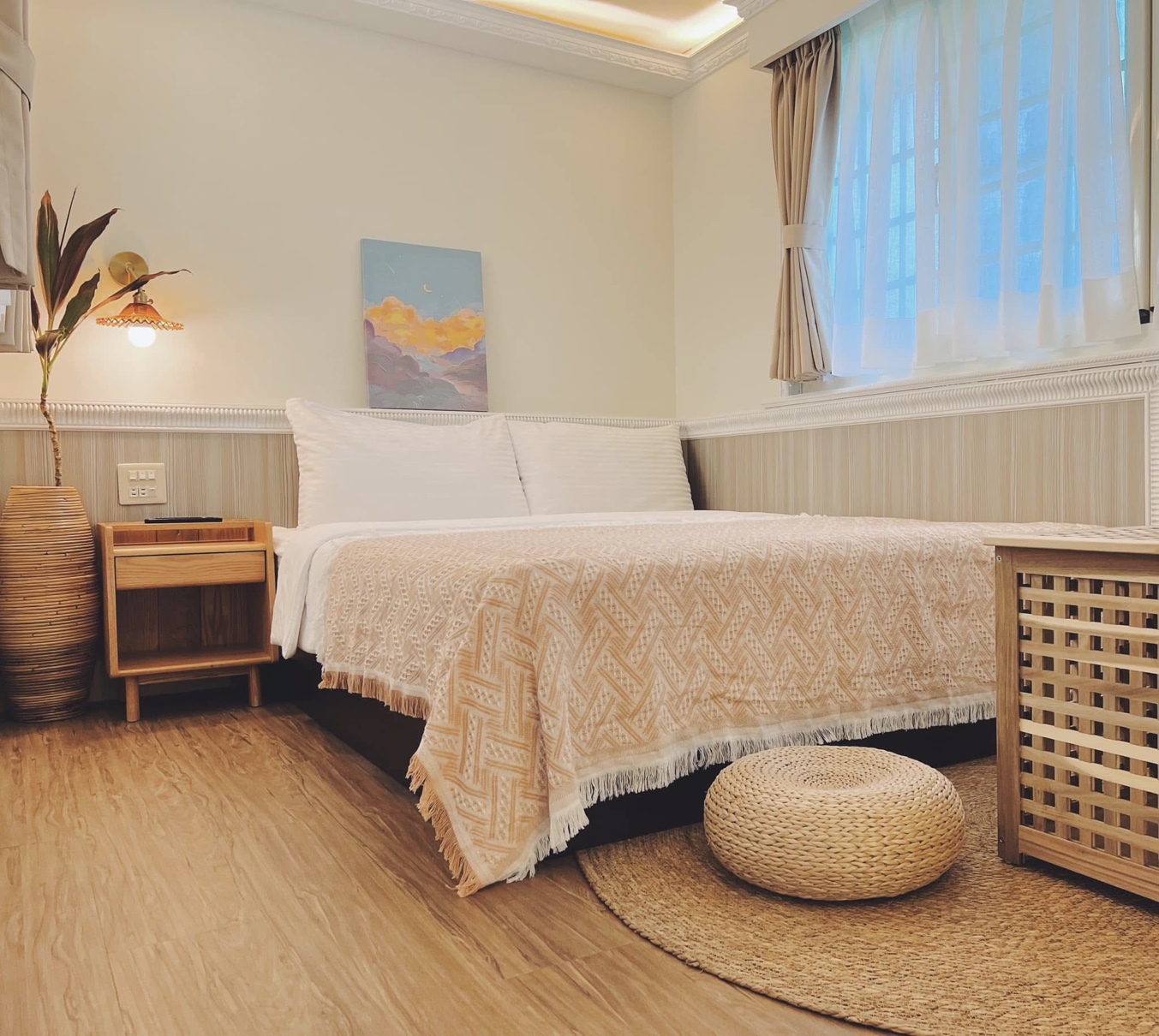 小巧而溫潤的客房,庭院植滿綠意,步行幾分鐘即可穿越防風林小徑,踏上海灘,沉浸自然懷抱。空間中看得見土地的節奏,也容得下放空與思考的片刻。